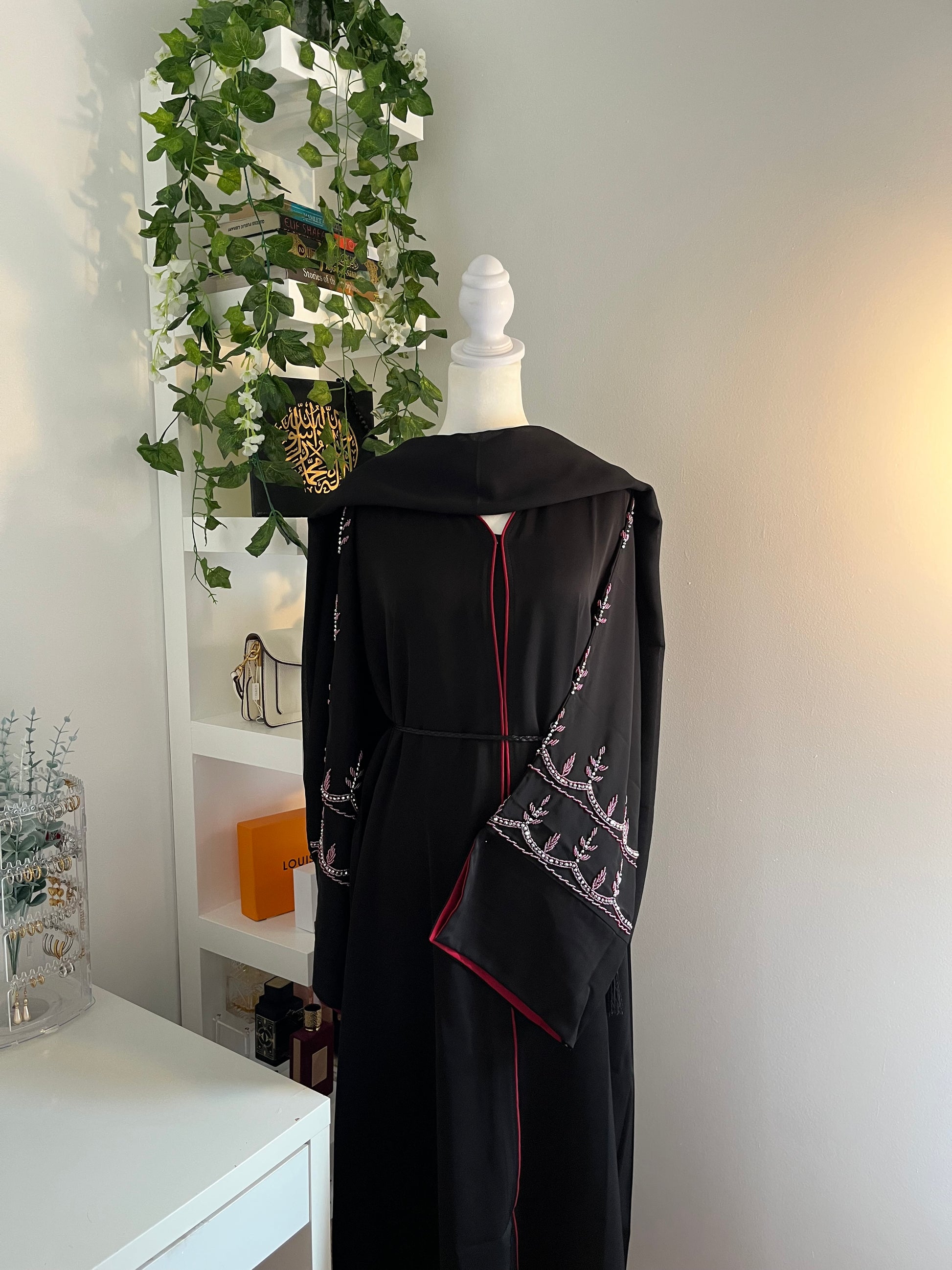 This is a nida fabric abaya with open slit sleeve and handwork. This abaya is a two-toned abaya.